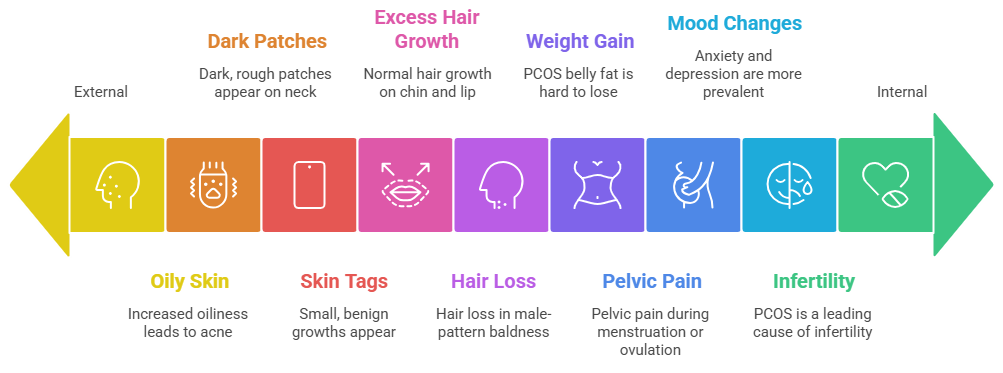 This connection plays a significant role in hormonal imbalance. Due to this, male hormones (like testosterone) increase, leading to multiple symptoms to PCOS such as acne, PCOS hair growth, and irregular periods.