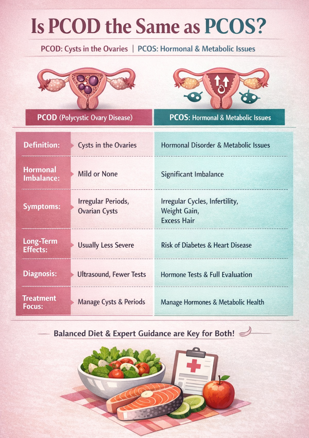 Polycystic Ovary Disease (PCOD) and Polycystic Ovary Syndrome (PCOS) are often confused but differ slightly. PCOD refers mainly to cyst formation in the ovaries, while PCOS involves hormonal imbalance and metabolic disturbances.