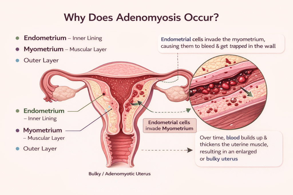 In adenomyosis, endometrial cells grow into the myometrium (muscle layer). These cells continue to behave like normal endometrial tissue, meaning they bleed every month. However, since the blood has no way to exit, it becomes trapped within the muscle layer.