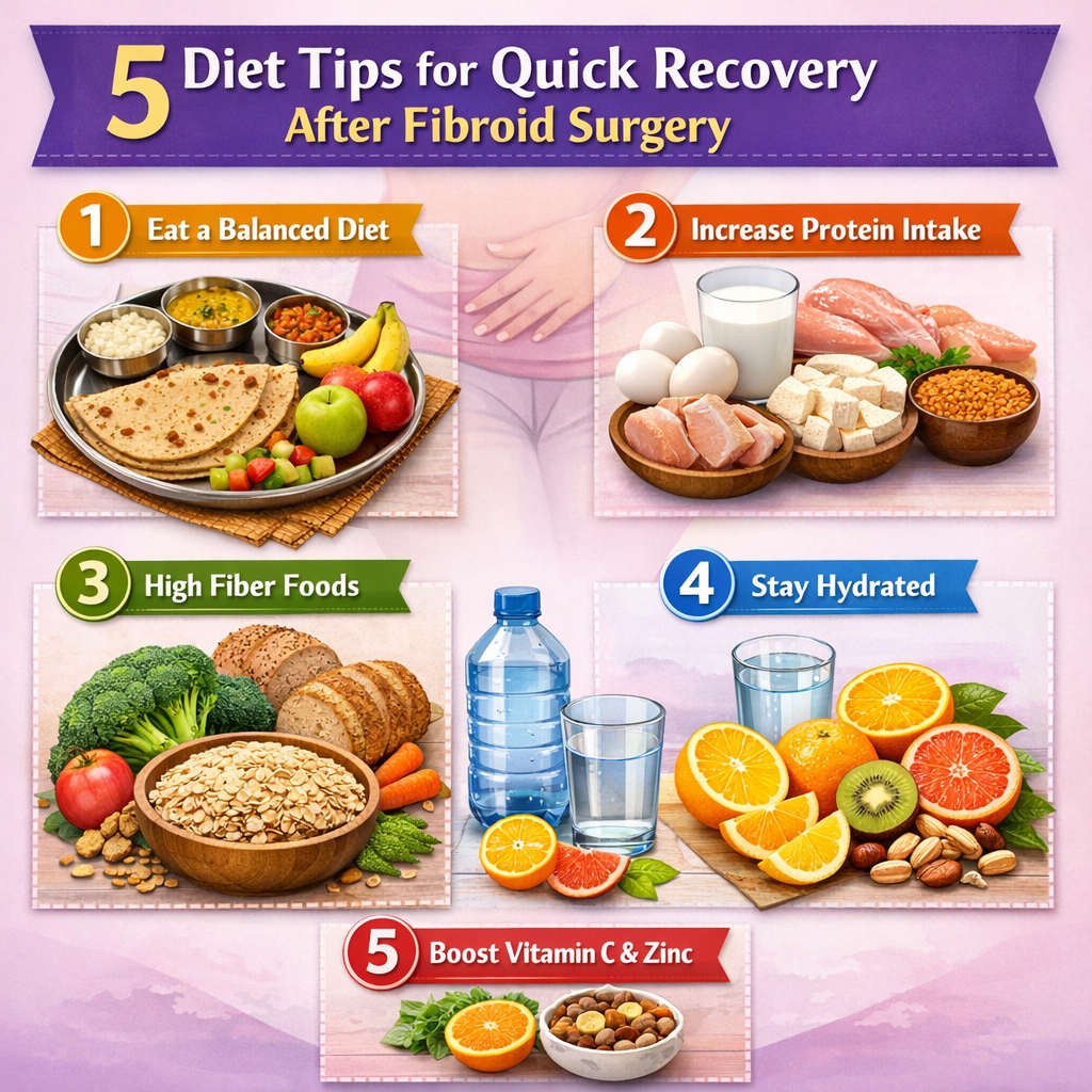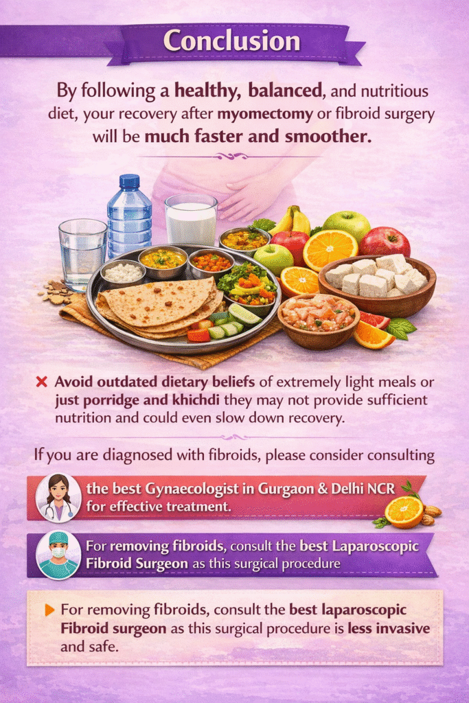 By following a healthy, balanced, and nutritious diet, your recovery after myomectomy or fibroid surgery will be much faster and smoother. Avoid outdated dietary beliefs that recommend extremely light meals or just porridge and khichdi, as they may not provide sufficient nutrition and could even slow down recovery.